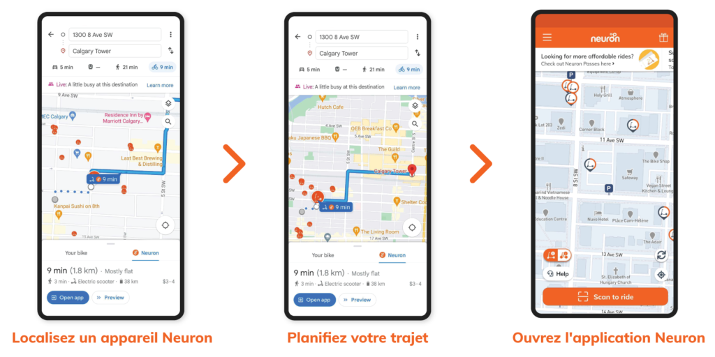 Nous sommes heureux d’annoncer notre intégration à Google Maps au Canada. Cela permettra aux usagers de Neuron de localiser facilement la trottinette ou le vélo électrique le plus proche, leur donnant ainsi un meilleur accès à une option de transport pratique pour le premier et le dernier kilomètre. L’intégration est disponible dans les villes canadiennes de Neuron, soit Vernon, Calgary, Lethbridge et Red Deer.